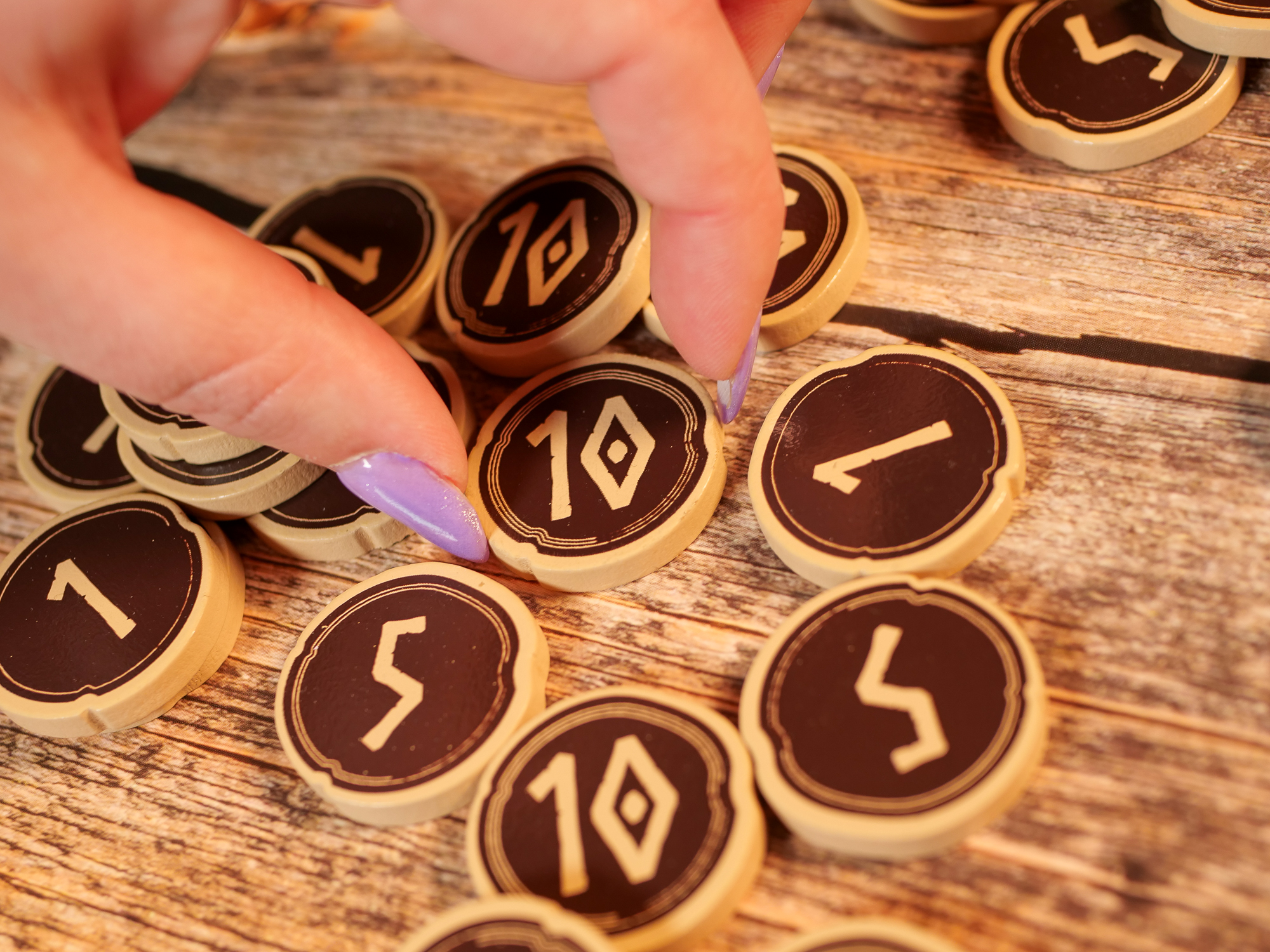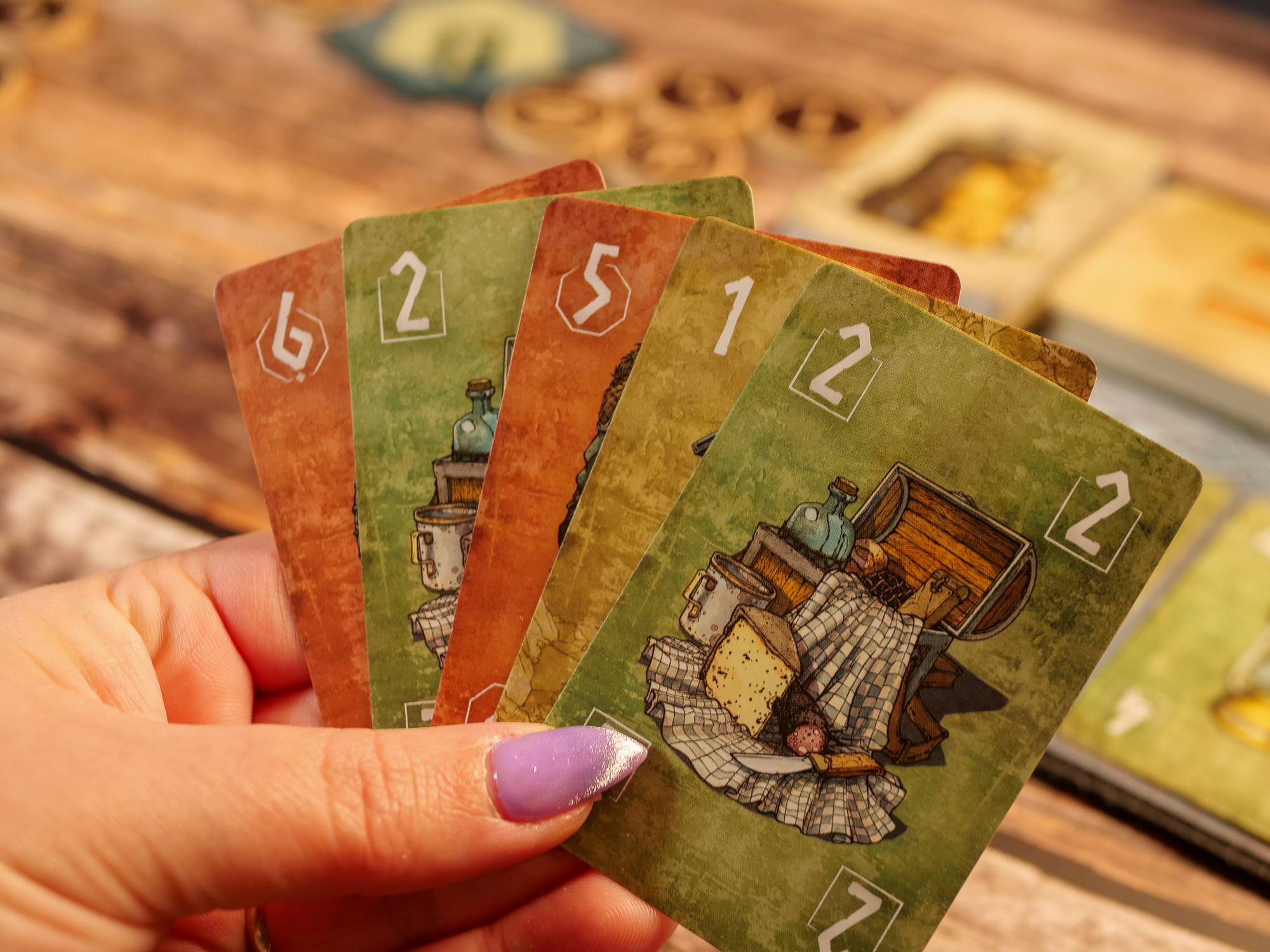 – Trök : choisissez 3 de vos cartes et révélez-les: la valeur totale la plus élevée détermine le maître du commerce. A votre tour, choississez une carte devant une autre personne et ajoutez-la à votre main, ou échangez-la avec le marché. C’est à la personne chez qui vous venez de vous servir de prendre une carte devant une autre personne et ainsi de suite jusqu’à que toutes les cartes soient prises.
